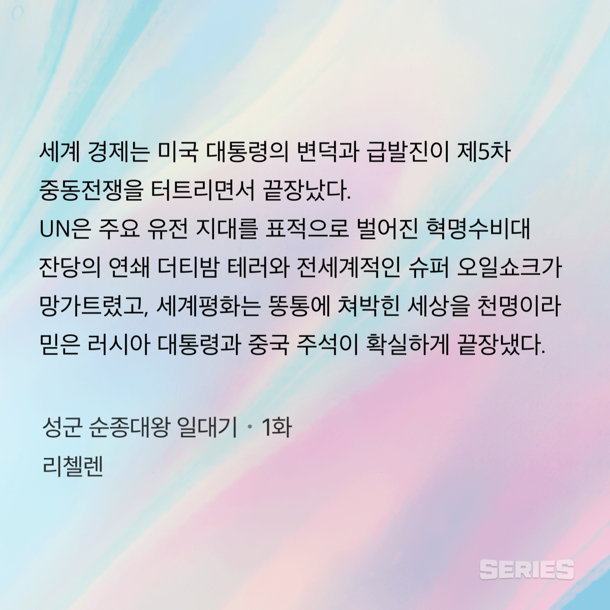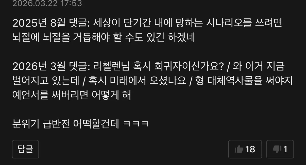 웹소설 주인공이 살고 있는 미래 사회가 완전히 붕괴된 상태라고 함연재 당시엔 독자들이 그냥 스토리를 위해 작가가 극단적으로 표현한 세계관이라고 생각했어그런데 완결 후에 1화를 다시 쓰면서 공개했대독자들의 반응 : ????작가 완결 후기 올렸어독자들이 지금 이렇게 중얼대고 있음 : 예언 쓸 거면 제발 좀 평화로운 미래 예언을 해주십시오