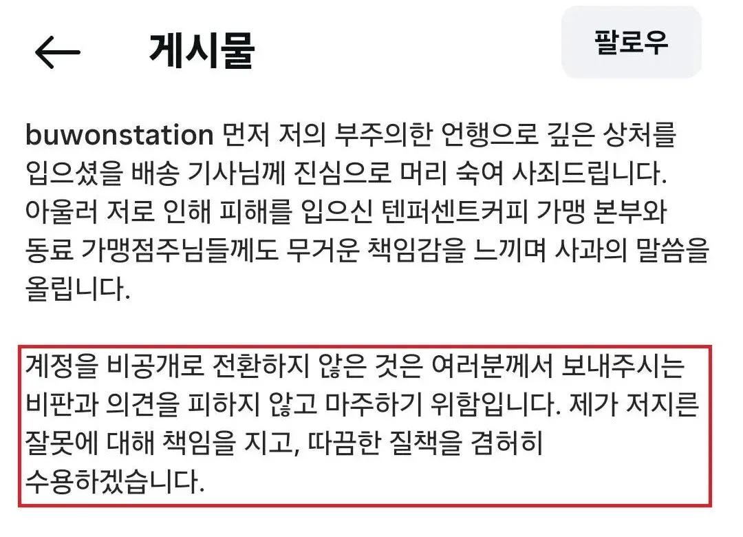 계정을 유지한 채 비난을 감수하겠다고 했고자신의 잘못을 받아들이겠다고 선언했으며따가운 질책도 겸허히 수용하겠다고 약속했지만끝내 SNS 계정을 완전히 삭제하며 마무리