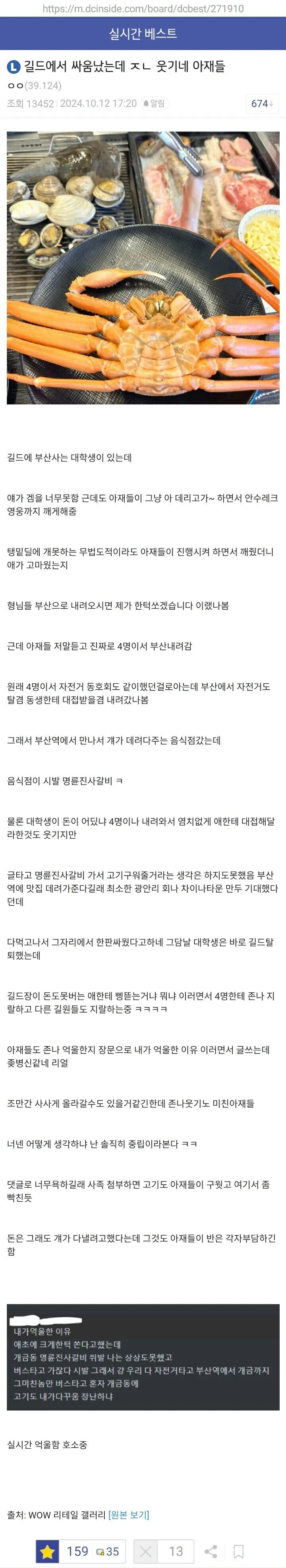 요약1. 대학생 와우저를 40대 아저씨 4명이 버스 태워줌2. 대학생이 고맙다며 부산에 오면 "크게" 한턱 쏜다함3. 40대 아저씨들 진짜로 부산까지 내려가서 한턱 쏘라함4. 아재들은 광안리 회나 차이나타운 만두 기대5. 대학생은 명륜진사갈비 데려갔고 고기는 아재들이 다 구움다 큰 어른들이 대학생 삥뜯는게 말이 되냐VS"크게" 한턱 쏜다했는데 명륜은 말도 안된다