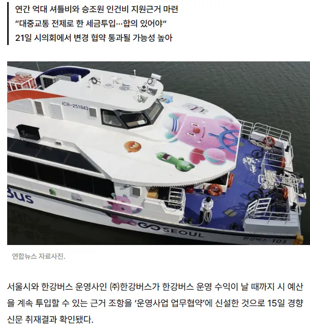 지원 기간은 한강버스가 이익을 낼 때까지다. 서울시의 한강버스 흑자 전환 예상시점은 첫 운항 후 2~3년 뒤다. 하지만 팔당댐 방류나 한강이 얼어붙는 등 계절 요인에 따라 한강버스 운항을 멈춰야 하는 기간이 발생했던 점 등을 고려했을 때 정확한 흑자전환 시점을 예측하기 어렵다.