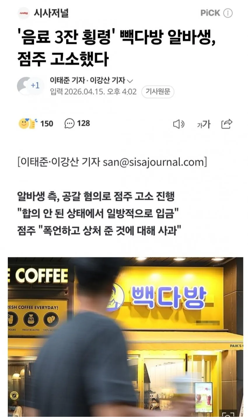 '음료 3잔 횡령' 빽다방 알바생, 점주 고소했다