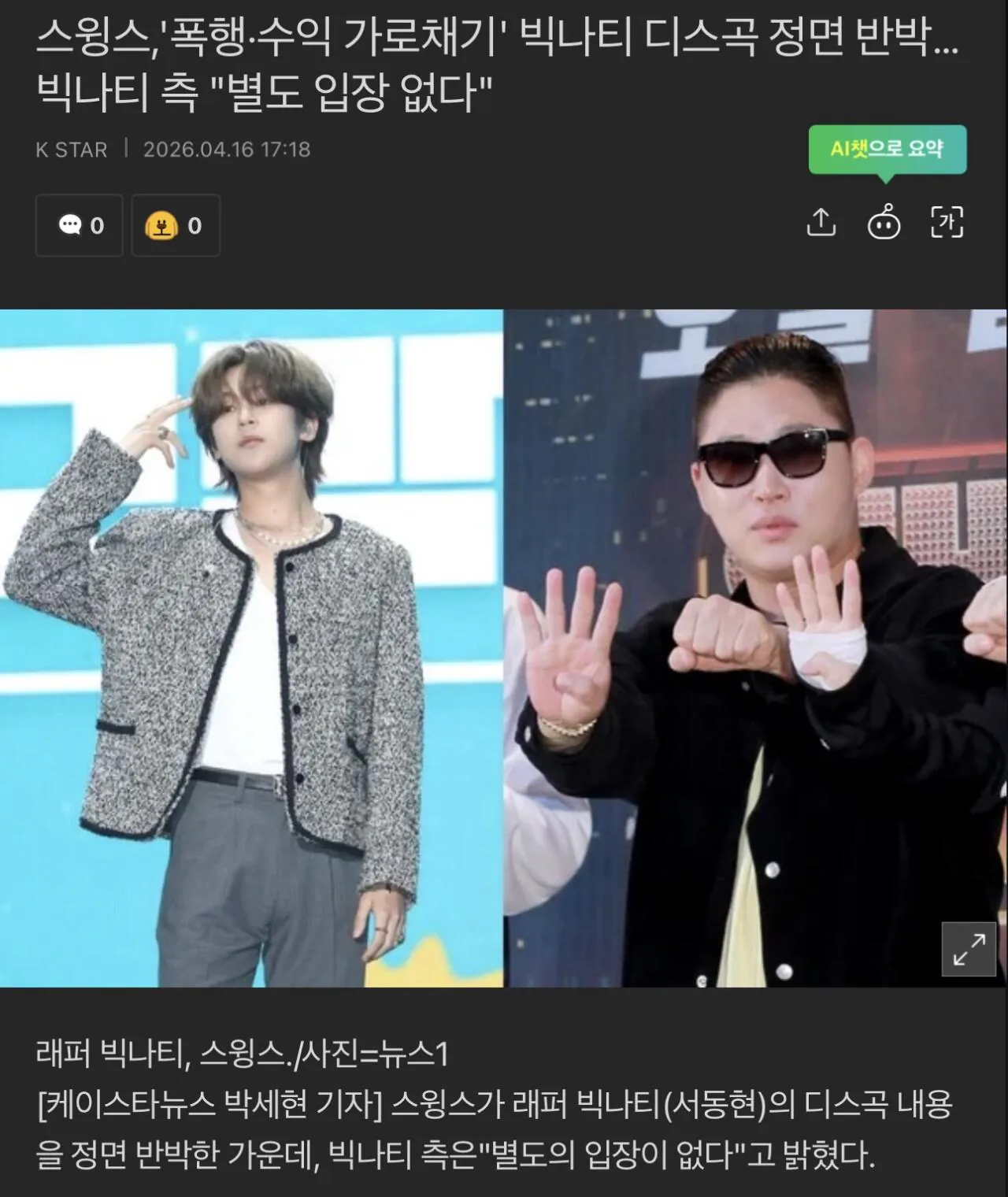 (속보) 스윙스,'폭행·수익 가로채기' 빅나티 디스곡 정면 반박…빅나티 측 "별도 입장 없다"