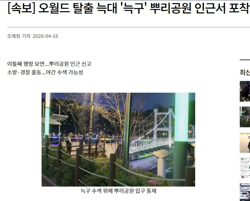 [속보] 오월드 탈출 늑대 '늑구' 뿌리공원 인근서 포착