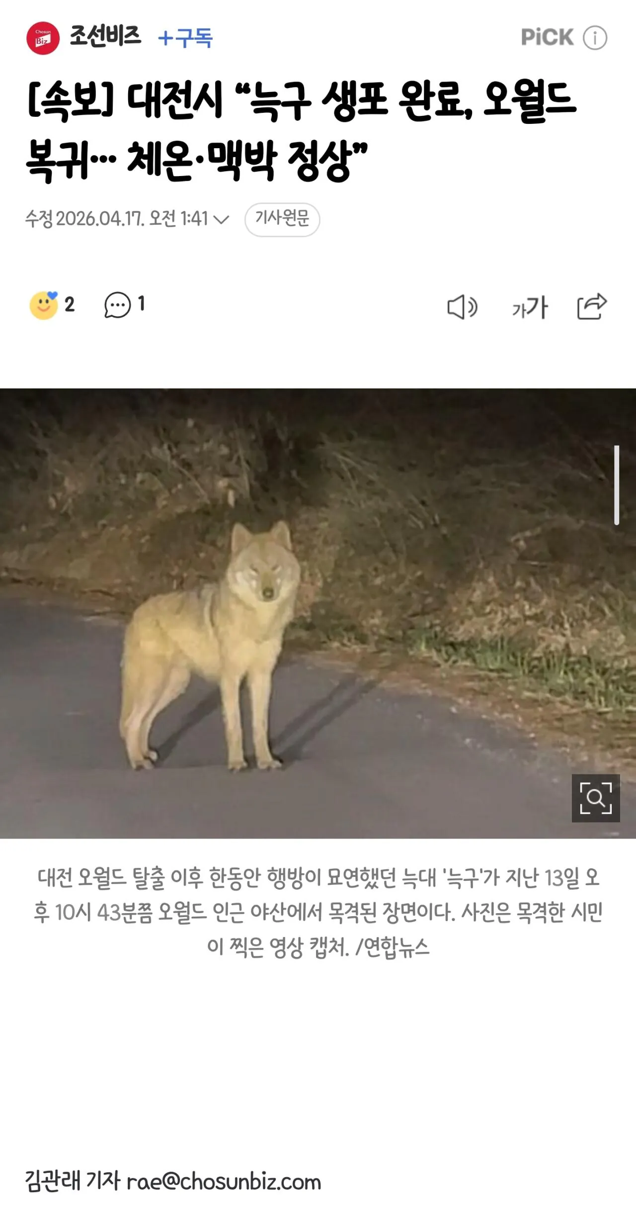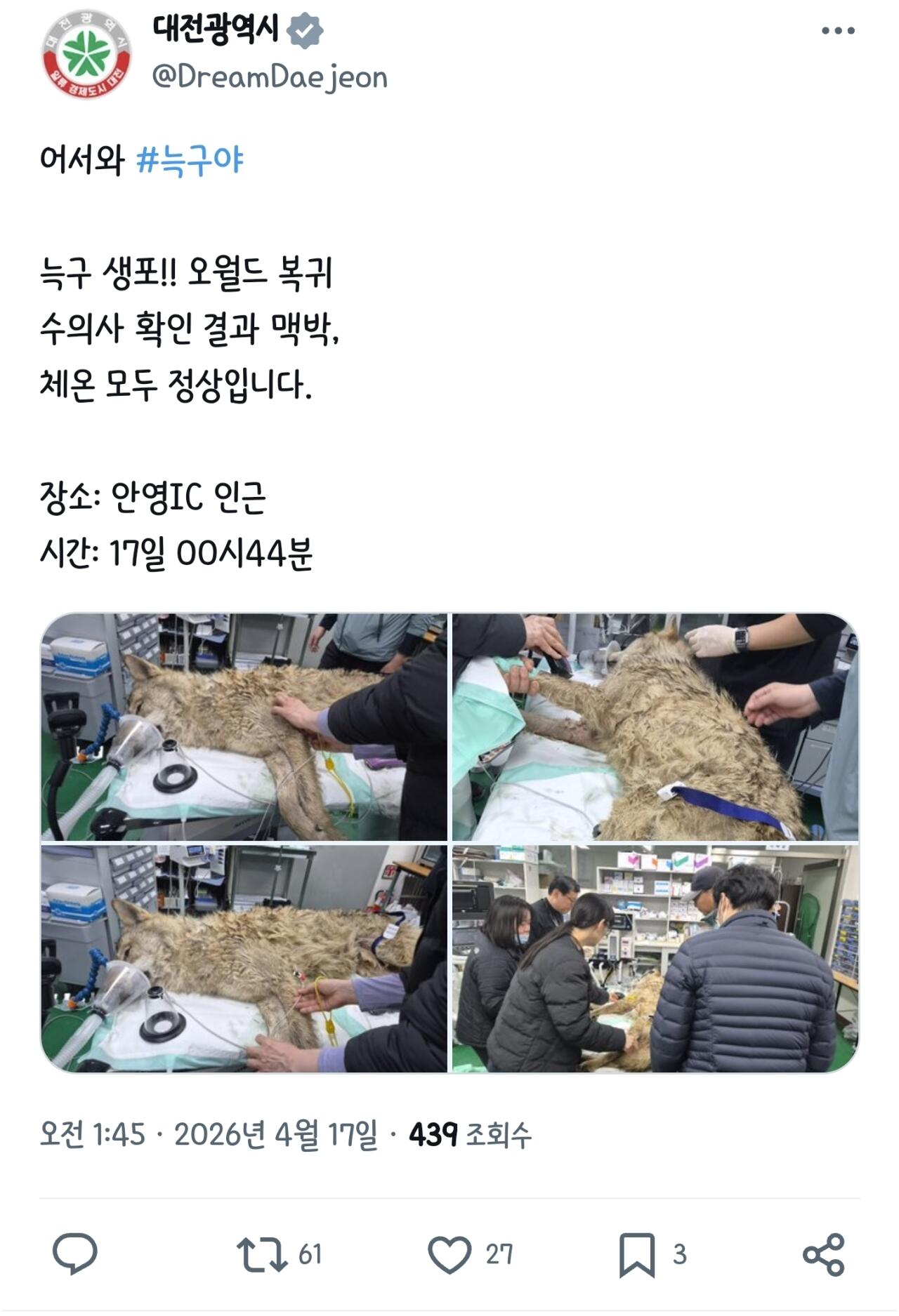 [속보] 대전시 “늑구 생포 완료, 오월드 복귀… 체온·맥박 정상”