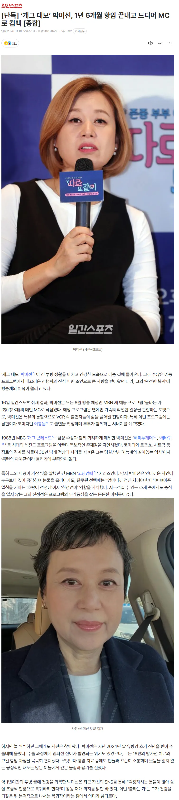 [단독] ‘개그 대모’ 박미선, 1년 6개월 항암 끝내고 드디어 MC로 컴백