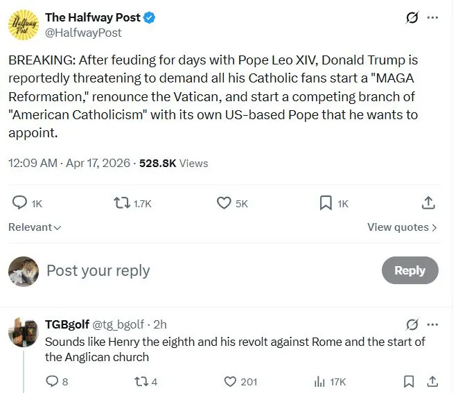 트럼프는 교황과 다툰 이후로 MAGA 개혁의 일환으로 바티칸과 관계를 끊고 자기를 지지하는 미국 가톨릭 신자들을기반으로 한 새로운 교황과 가톨릭 분파를 만들겠다고 협박중임.사람들은 영국 성공회처럼 트럼프가 미국 가톨릭을 독립시키려는 것 같다는 반응임.미국 가톨릭 만들고 진짜 트럼프 스스로 교황으로 취임하면 개웃길듯.