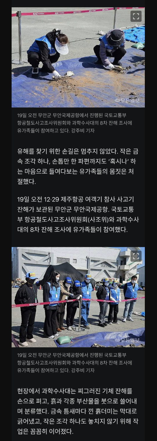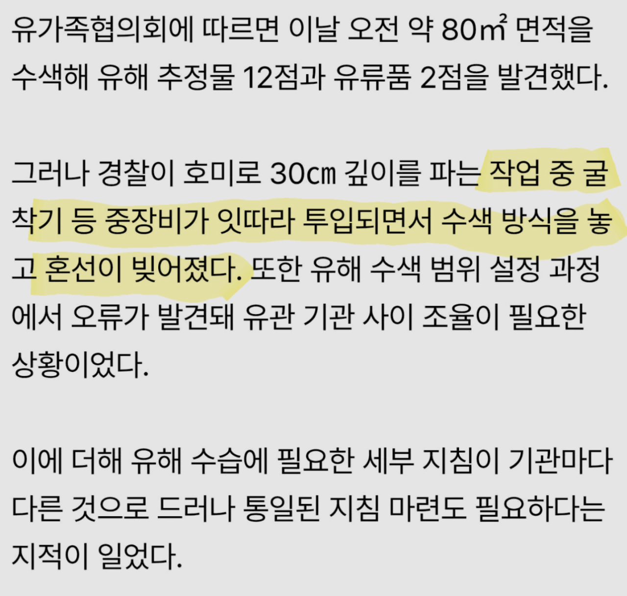 1. 유가족들은 유해가 훼손될까봐 호미랑 맨손으로 흙을 파내고 뜰채에 걸러내며 조심스럽게 수색하고 있는데2. 갑자기 굴착기와 중장비를 끌고와서 파내려고 시도하다가 유가족들의 강한 저항으로 무산됨..3. 수색과정에서 쥐똥으로 범벅된 유해가 발견4. 참사가 발생한지 1년이 훨씬 지났지만 사고 원인을 규명하는데 중요한 '플랩 컨트롤'이 발견되기도 하는등5. 유가족협회의 강한 반발이 있었고 현장상황은 매우 부실하고 어지러운 상태