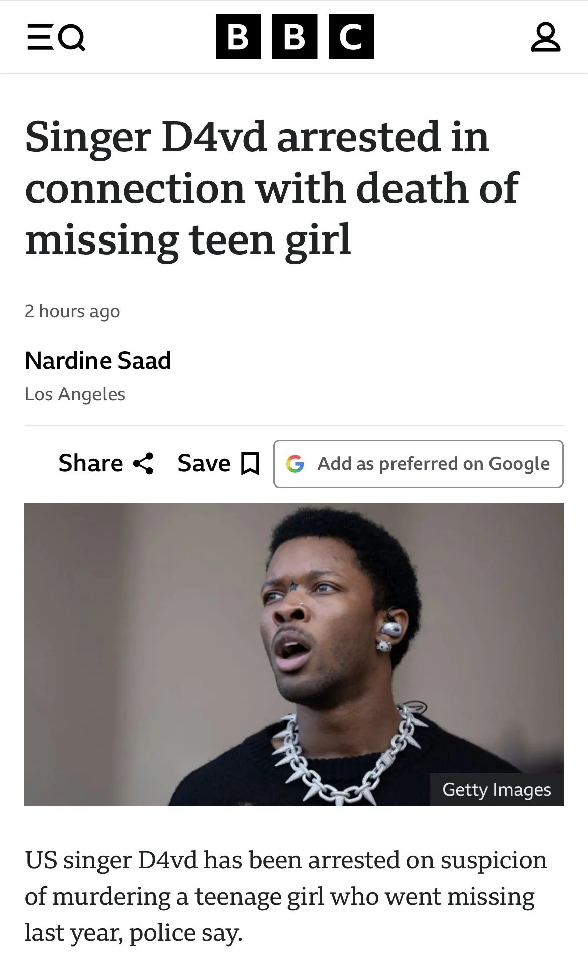 차량 내에서 사망자가 발견된 사건 이후미성년 피해자 살해 혐의로 수사를 받고 있던 가수 d4vd