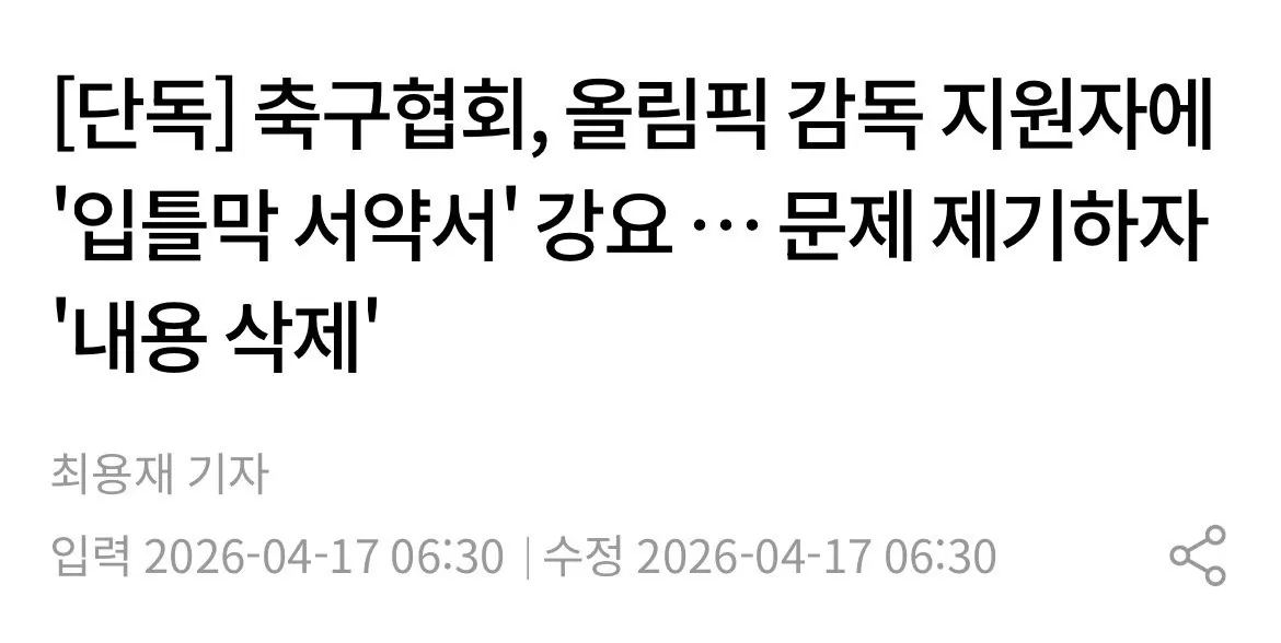[단독] 축구협회, 올림픽 감독 지원자에 '입틀막 서약서' 강요 … 문제 제기하자 '내용 삭제'
