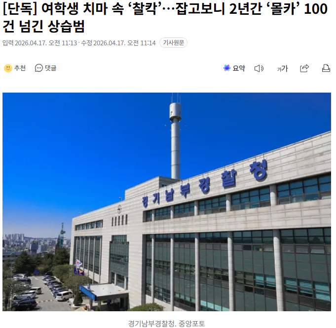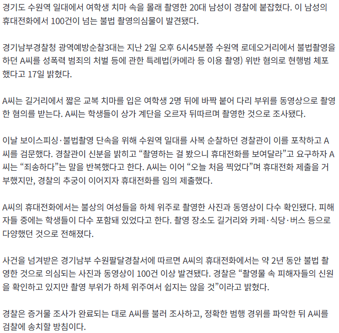 여학생들을 대상으로 불법 촬영을 반복해온 남성이 경찰에 붙잡혔다. 무려 2년이라는 기간 동안 100건이 넘는 범행을 지속적으로 저질러온 상습범으로, 경찰의 수사를 통해 정체가 드러났다.