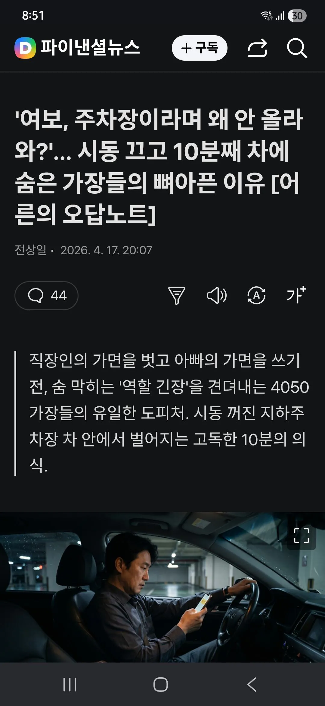 집 가기 전 주차장에서 차 안에만 10분간 있는 가장들. 무엇이 그렇게 필요할까?