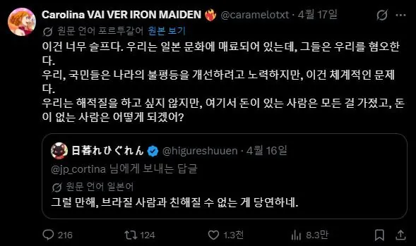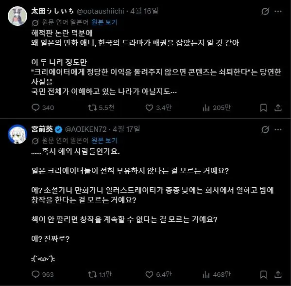 트위터 내 불법 번역 논쟁이 국제 싸움으로 번졌다. 한국과 일본 사용자들은 불법 번역이 창작자 수익을 빼앗고 산업 기반을 약화시킨다고 주장한다. 반면 해외 사용자들은 경제적 형편상 정가로 구매할 수 없다며 대항했다.