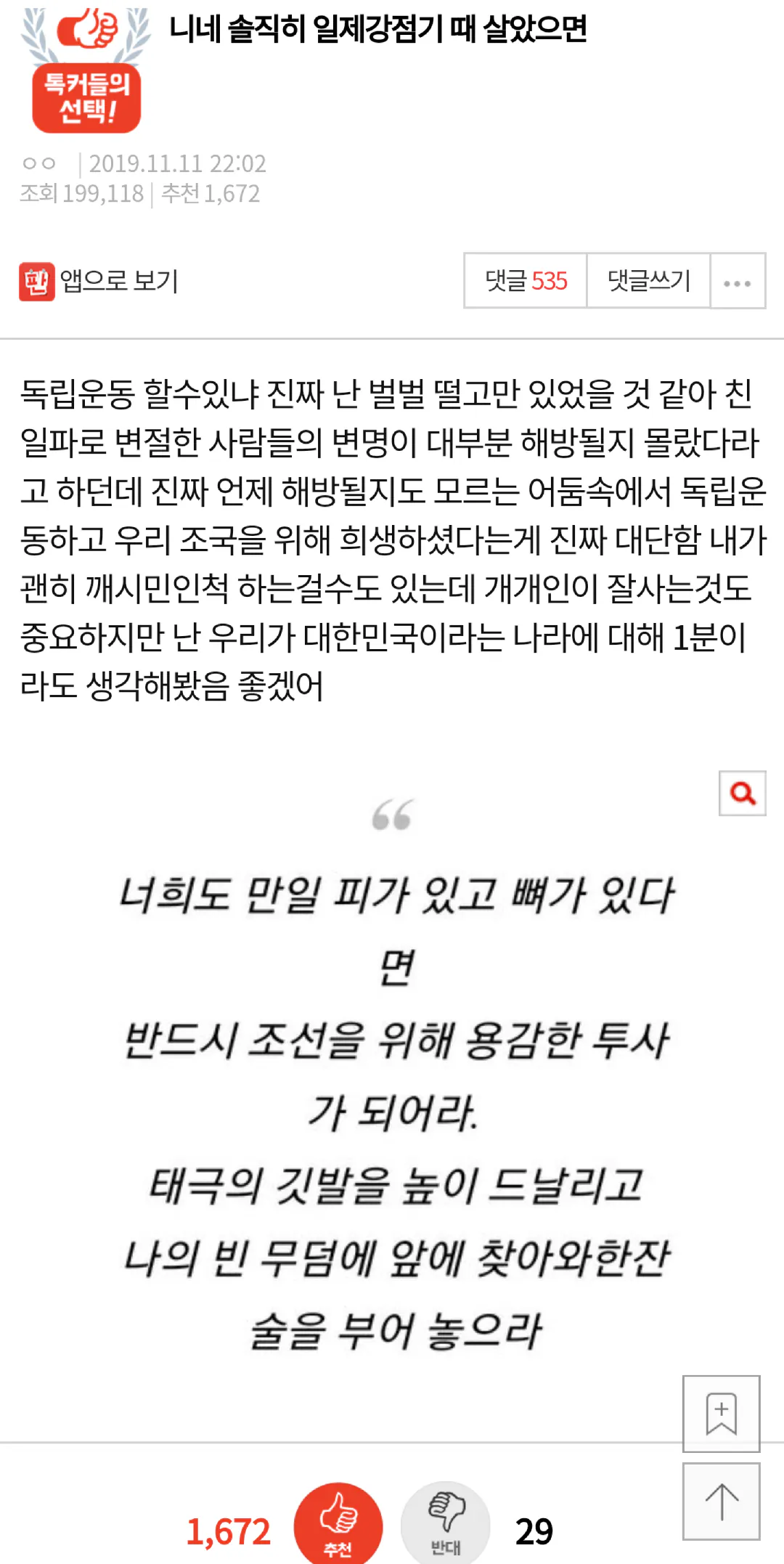 그때 화제였던 입이 거친 애국글이 다시 떠올랐다고 하네