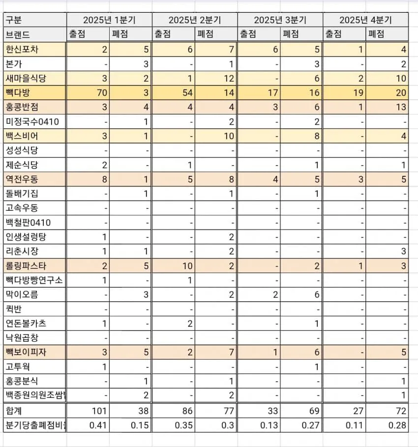 초반엔 출점이 많았음. 1분기에 101개 오픈에 38개 닫음. 근데 2분기부턴 달라짐. 86개 오픈했는데 77개를 폐점. 3분기는 더 악화됨. 33개만 오픈했는데 69개를 닫아버림. 4분기 결국 최악. 27개 오픈에 72개 폐점... 4분기 숫자들은 정말 답이 없는 수준이라고 봐