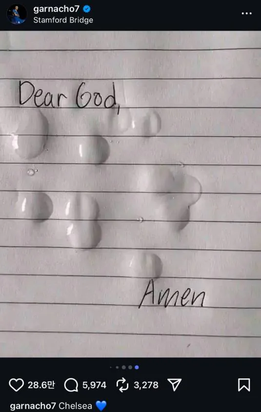 당시에 인스타에 올렸던 게시물인데, 공책에 '신이시여..아멘'이라고 쓰고 눈물을 흘린 내용이었더라.악플 때문에 삭제했었는데,이제는 상황이 역전돼버렸네... 첼시 측이 눈물을 쏟고 있다니