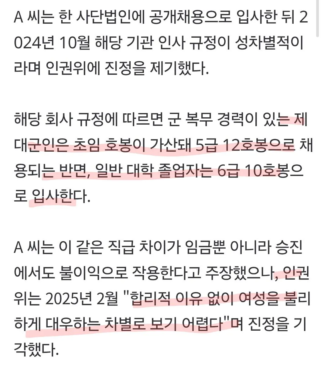 2월에 나온 법원 판결 있었어. 인권위는 성차별 아니라고 했는데, 법원이 다르게 봤어. 결국 성차별로 판단된 거고. 정말 충격이네. 국가 기준이 점점 엄해지는 거 맞는 것 같다.