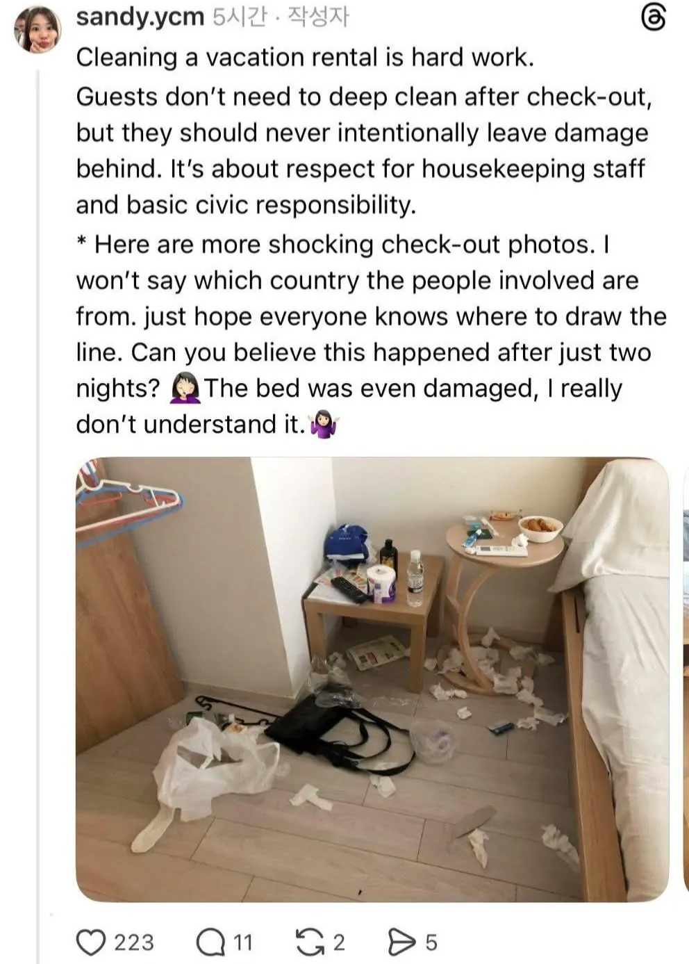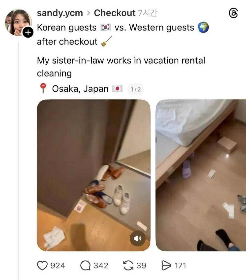 일본 오사카 숙박업 대만인이 손님 방 정리 영상을 올렸는데, 한국인과 서양인을 구도로 만들어 한국을 폄하하는 식으로 편집했다.