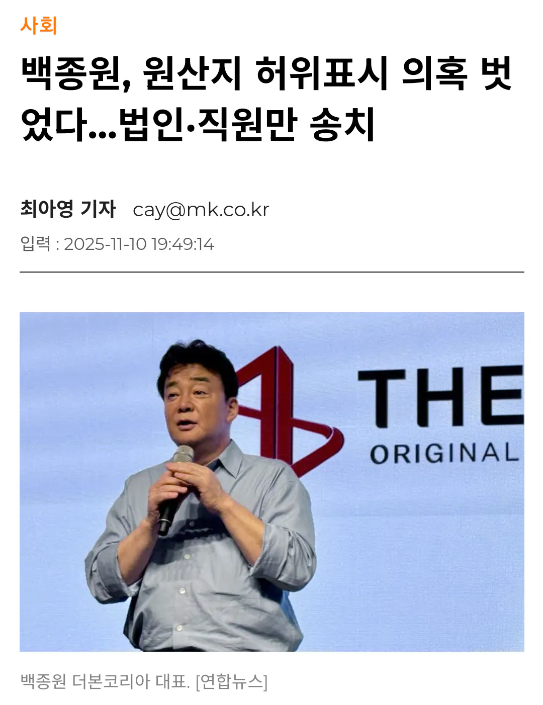 어쨌에 법원도 백종원 대표랑은 상관없다고 판단했다더라제조사, 협력업체, 수입 업체 등 여러 곳이 행정처분 받고공장 운영까지 일시 중단됐었음그런데 다 회사 수준의 문제일 뿐, 대표는 무관하다는 걸 증명한 거지결국 회사만 처벌받고 대표는 송치도 안 됐대