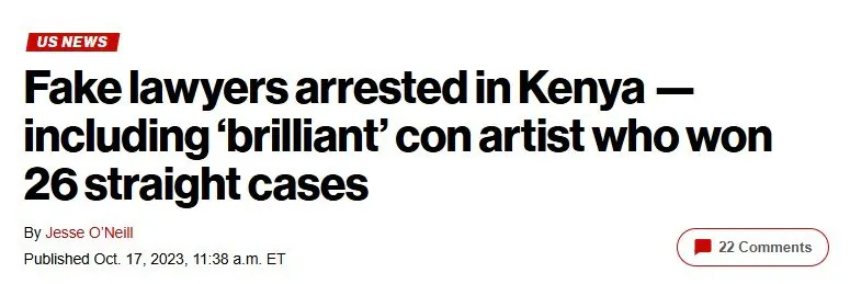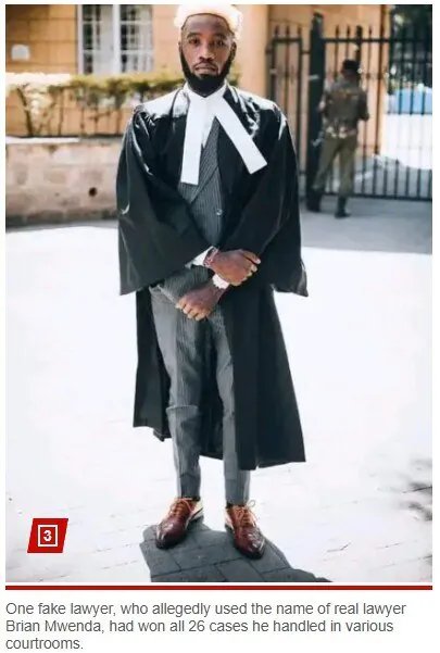 케냐에 사는 한 남자가 변호사 명의를 도용해서 법정에 나왔다. 26개 사건을 모두 승소시켰다고 한다.적발되어 자신이 피고인이 되는 상황이 됐는데, 믿기지 않게도 본인의 재판까지 이겨버렸다는 얘기다.