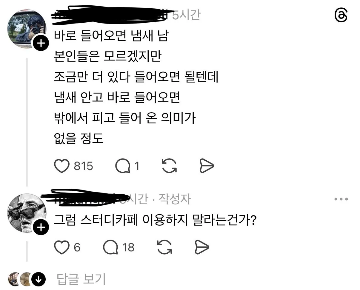 담배 냄새 때문에 스터디카페서 눈치 본다던데
