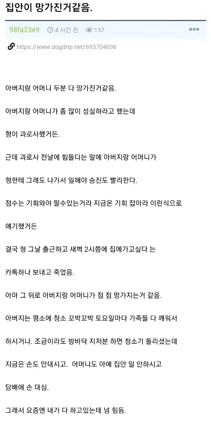 일 때문에 형을 잃고 가족 전체가 박살났어