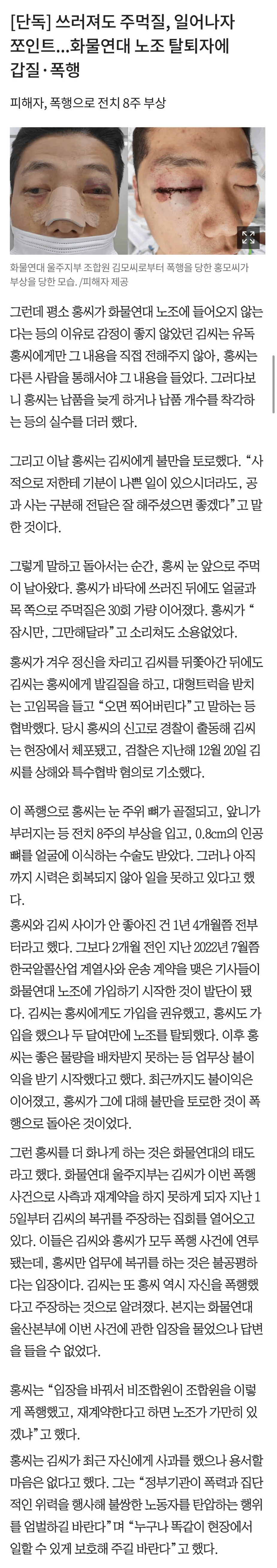 24년에 실제로 일어난 사건이고,화물연대를 나간 운전자가 조직으로부터 업무상 불이익을 당했어.피해자가 "공과 사는 나눠야 한다"고 항의하자조직원들에게 집단 폭행을 당하게 돼.그 폭력으로 인해 고용계약이 해지되자자신의 일자리 복귀를 요구하는 시위를 벌인 일이야.
