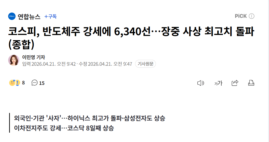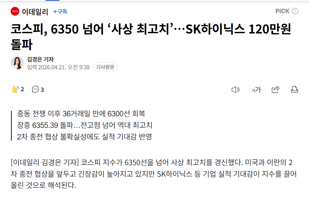 코스피가 역대 최고가를 경신했고, 하이닉스는 120만원을 돌파했다는데 대박이네