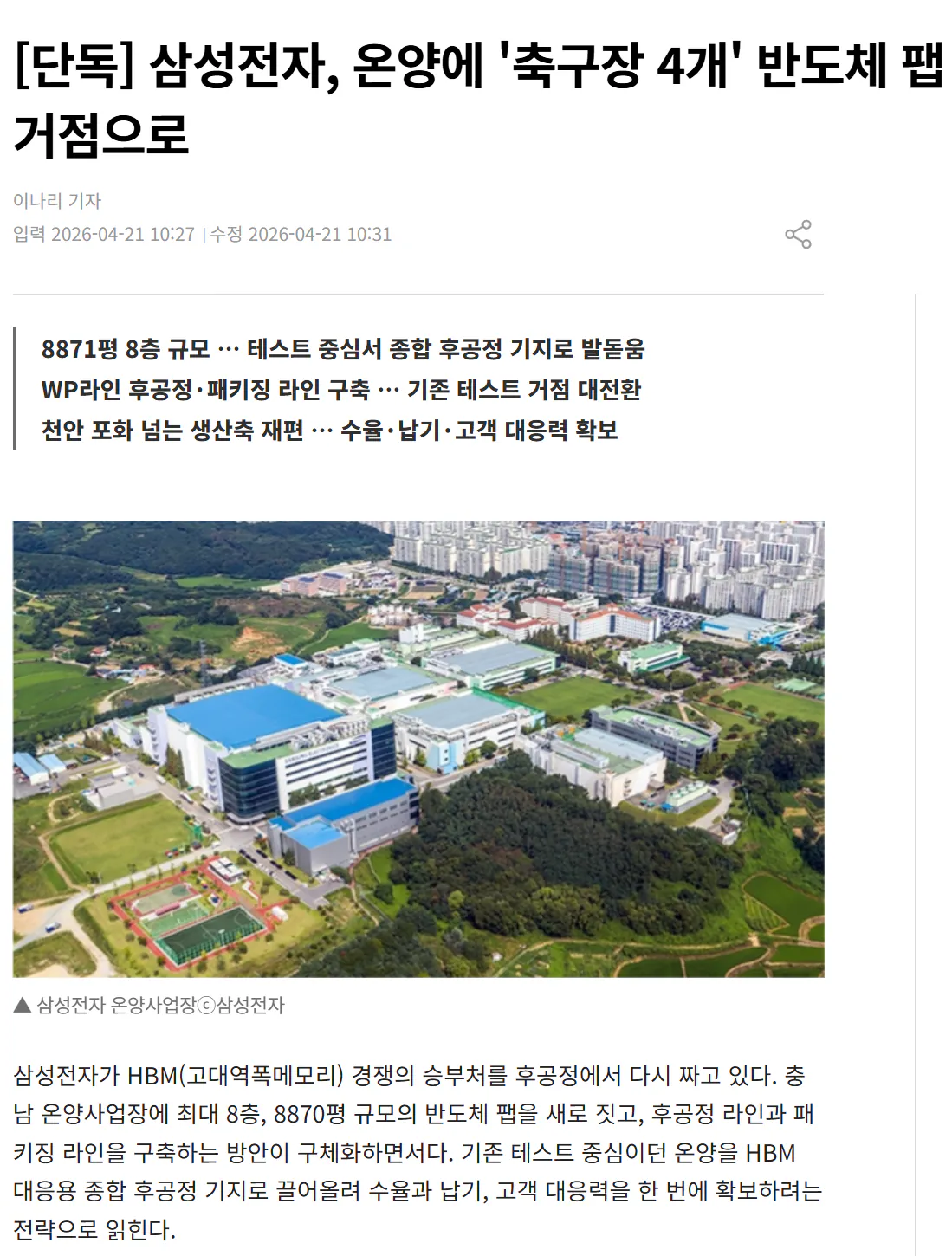 온양 삼성 반도체 팹 신설, 후공정 중심지 될 듯