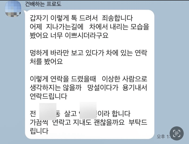번호를 직접 달라고 한 게 아니라 주차된 차 번호판을 봐서 찾아서 연락했다고... ㄷㄷ