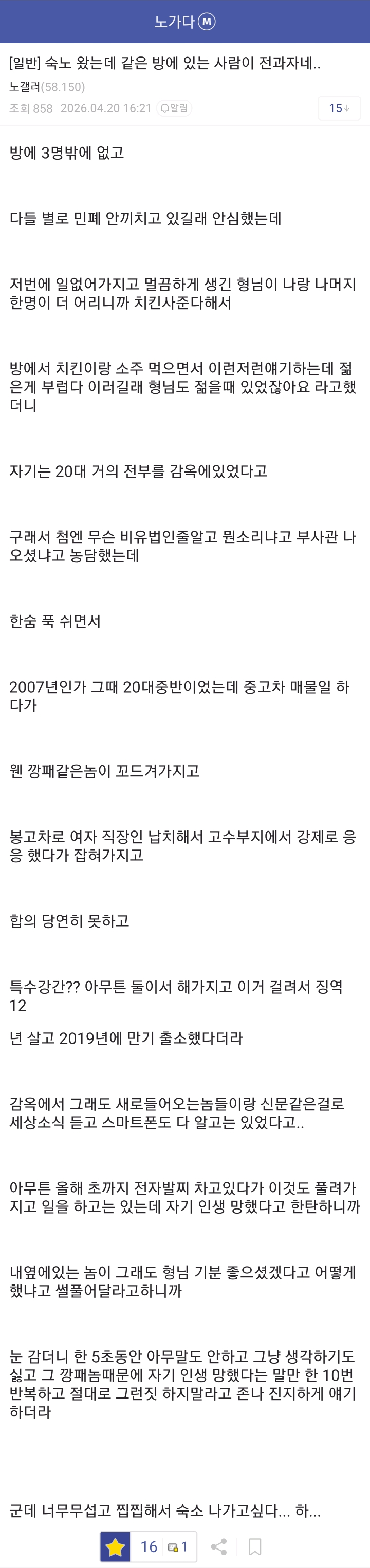 일하면서 자는데 같은 방 사람 신상이 충격적이네