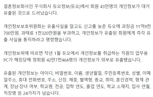 듀오에서 43만 명 사용자의 개인정보가 고스란히 새나간 거 같은데, 피해자들한테 아무도 통보를 안 했대. 미디어 기사로 우연히 알게 됐다는 사람들도 있고... 이렇게 해도 괜찮은 건가 싶네.