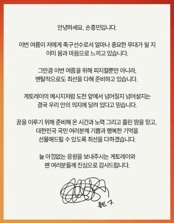 손흥민도 SNS로 화답했다. 올여름이 자신에게 얼마나 중요한지 뼈저리게 느끼고 있으며, 피지컬과 멘탈 모든 면에서 최선의 준비를 하고 있다고 전했다. 의지가 행동을 결정한다고 믿으며, 지금까지의 준비 과정과 노력을 믿고 국민들에게 기쁨을 돌려주겠다는 각오를 드러냈다.