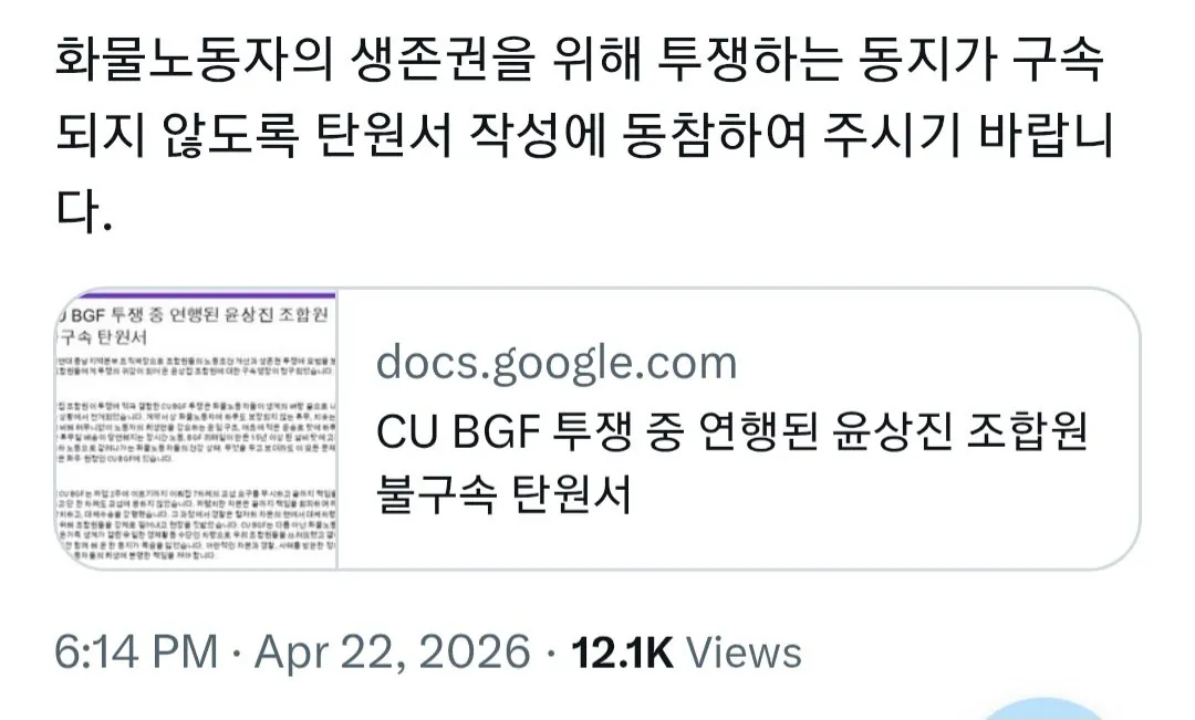 화물연대 조합원이 경찰의 과도한 진압으로 부상을 당했는데, 이 분이 구속되지 않도록 하기 위해 민주노총에서 탄원서를 제작하고 서명을 받고 있습니다.