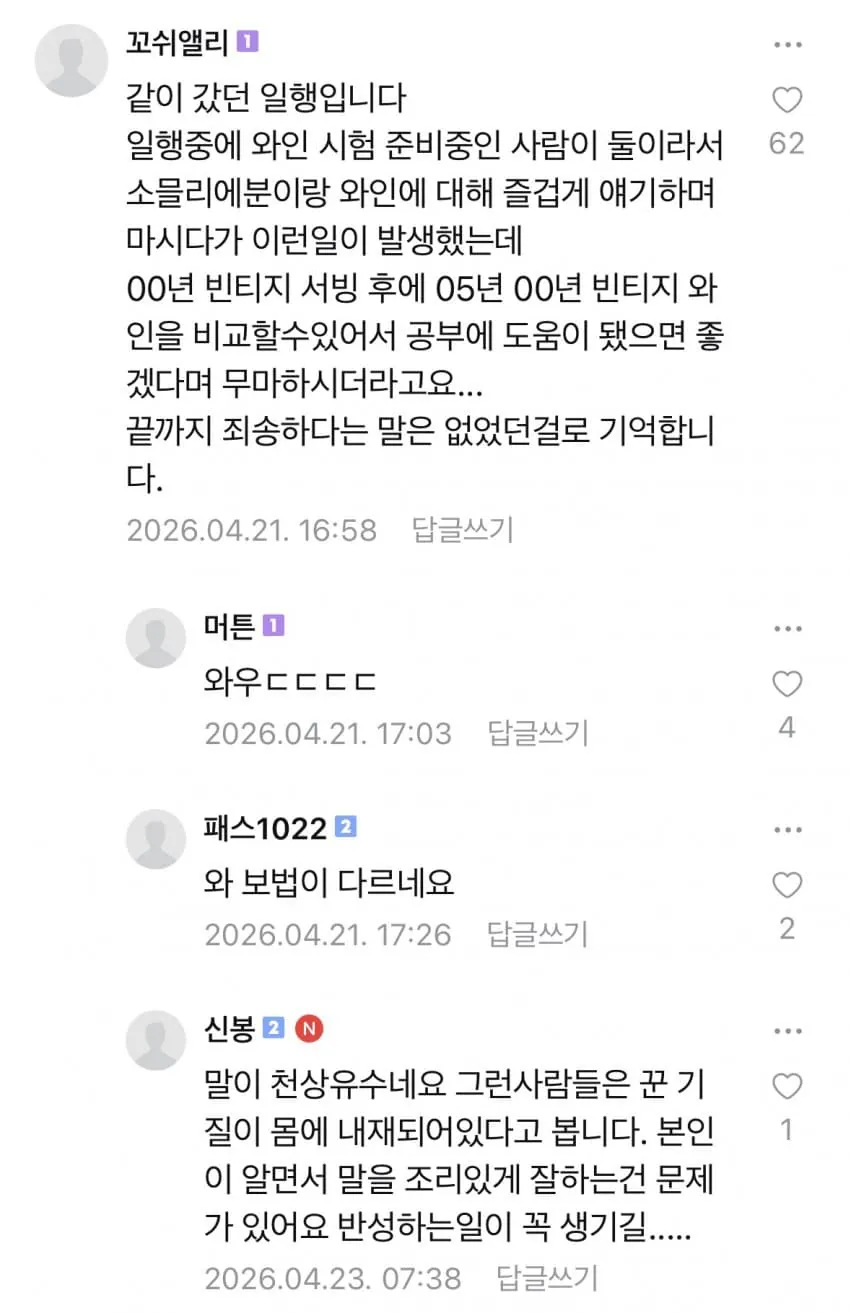 와인 논란 주인공 일행분이 댓글 달았네