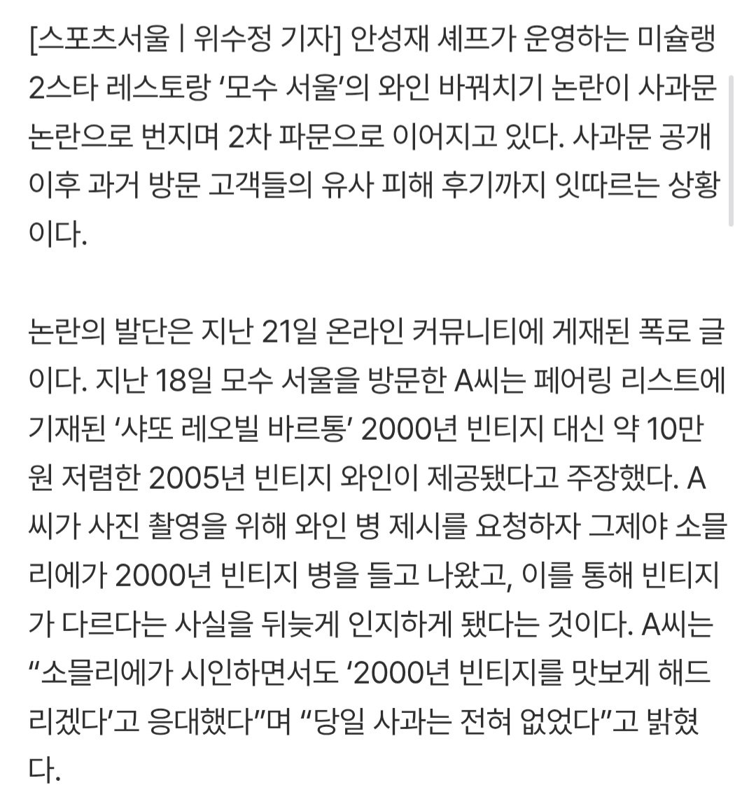 안성재 모수 서울, ‘와인 바꿔치기’ 처음 아니다? 비슷한 피해 줄줄이 등장해