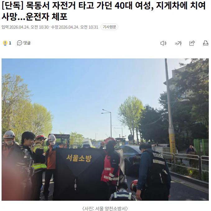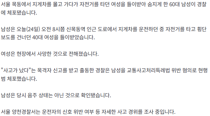 목동 지역에서 자전거를 타고 있던 40대 여성이 지게차와의 접촉으로 사망 사고가 발생했다.