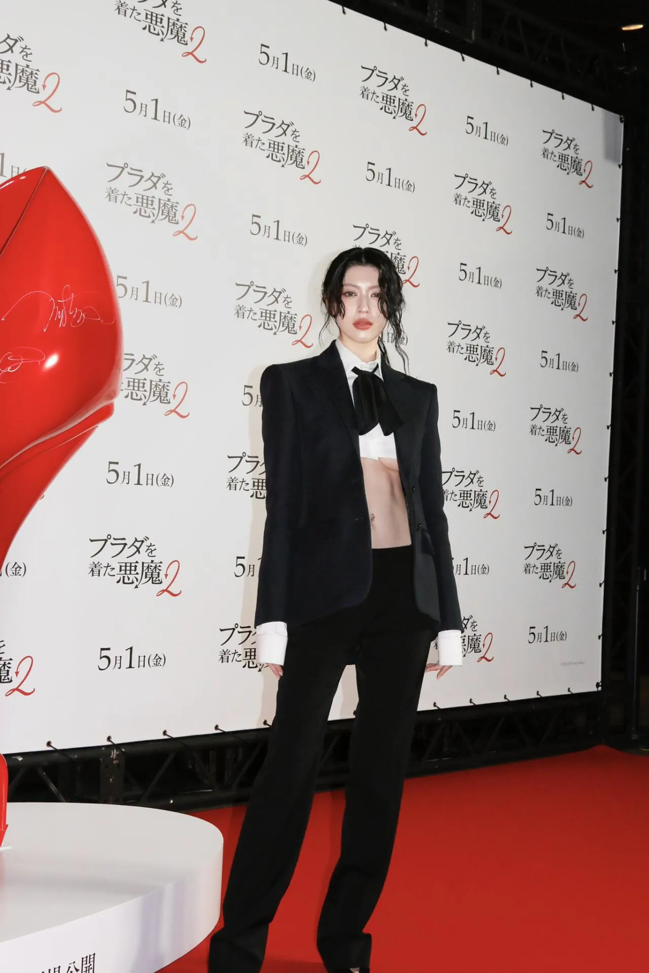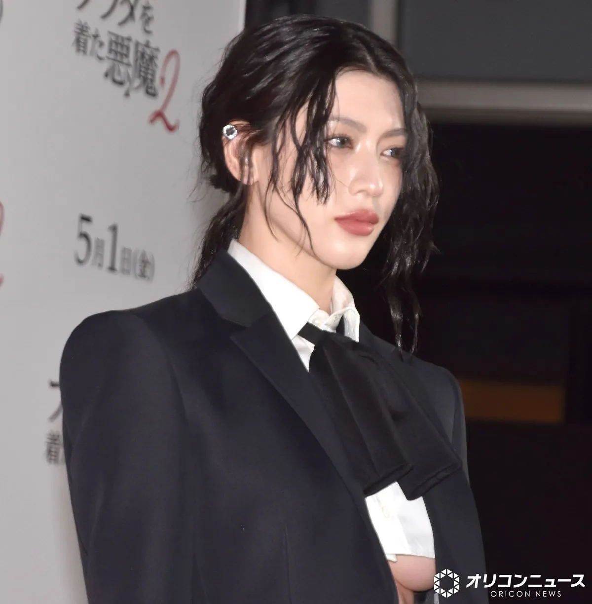 일본에서 개최된 악마는 프라다를 입는다 2 시사회에 출석한 미요시 아야카가 언더붑 룩으로 주목받고 있다고 함