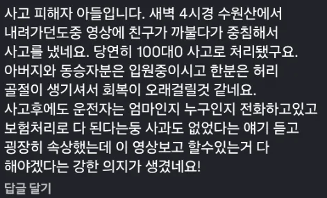 피해자 가족이 댓글을 남긴 이유는 명확했다. 아버지와 탑승자가 중상을 입었는데, 가해자가 아무런 사과 없이 영상을 올린 것이다.