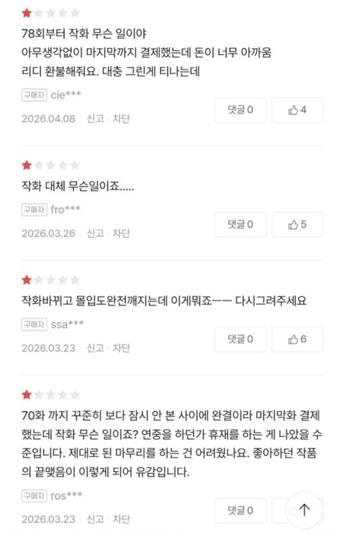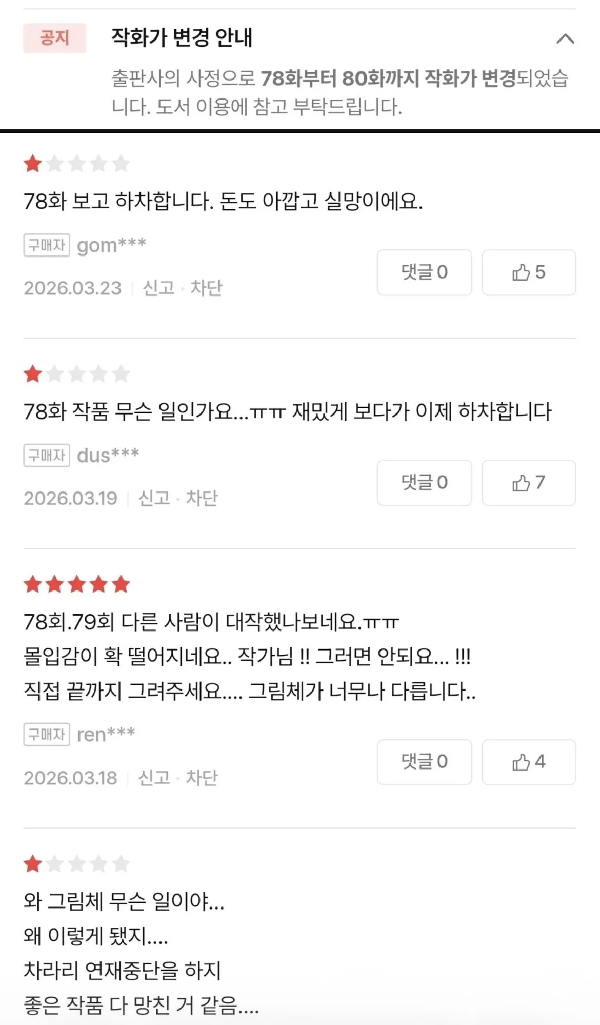 댓글 보니 진짜 난리임. 그림체가 완전히 바뀐 거 같다고 불만하는 사람들 투성. 팬들이 속속 이탈하고 있는 상황이래. 차라리 휴재를 받는 게 나았겠다는 반응이 많음.