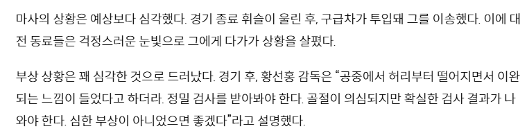 오늘 발생한 부상이 정말 심각한 수준이라고 한다. 피해 선수는 척추 손상으로 최소 5개월 전치가 예상되며, 실려갈 때 목까지 움직일 수 없었다고 한다.