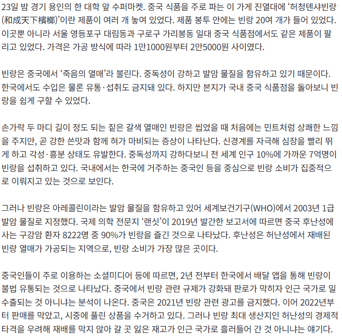 죽음의 열매라고 불리는 빈랑이 한국 시장에서도 유통 중인 것으로 파악됐습니다. 중국산 해당 제품이 국내에서 판매되고 있는 상황입니다.