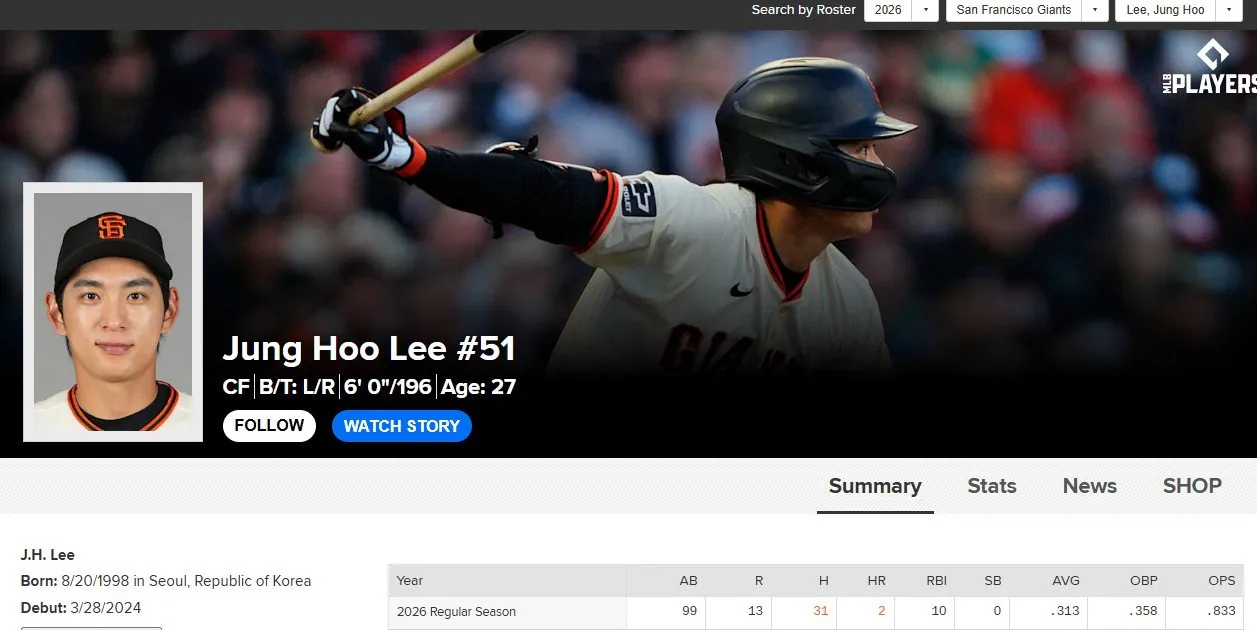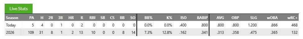 109타석에 나가서 99타수 중 31개 안타를 기록했어(2루타 8개, 홈런 2개)13득점 10타점을 올렸고타율 0.313 출루율 0.358 장타율 0.475 OPS 0.833wRC+ 132