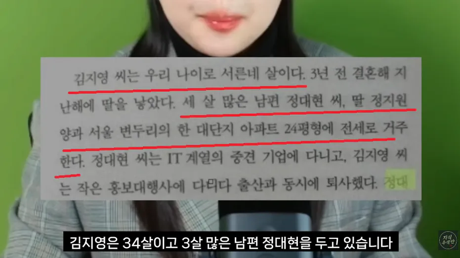 남편은 IT업계 기업에 근무 중이고, 김지영은 PR회사에 다니다가 아이 출산 후 그만둠.