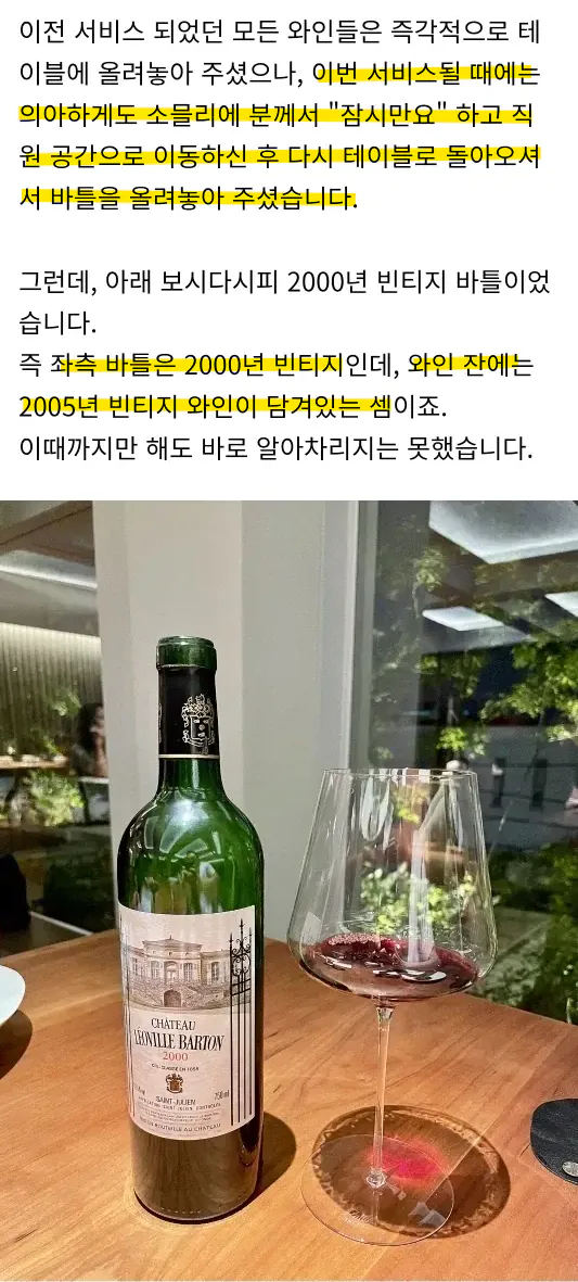 테이블에 2000년 빈티지 병을 놓고 손님들엔 2005년 빈티지를 따라줬다고 하더라.
