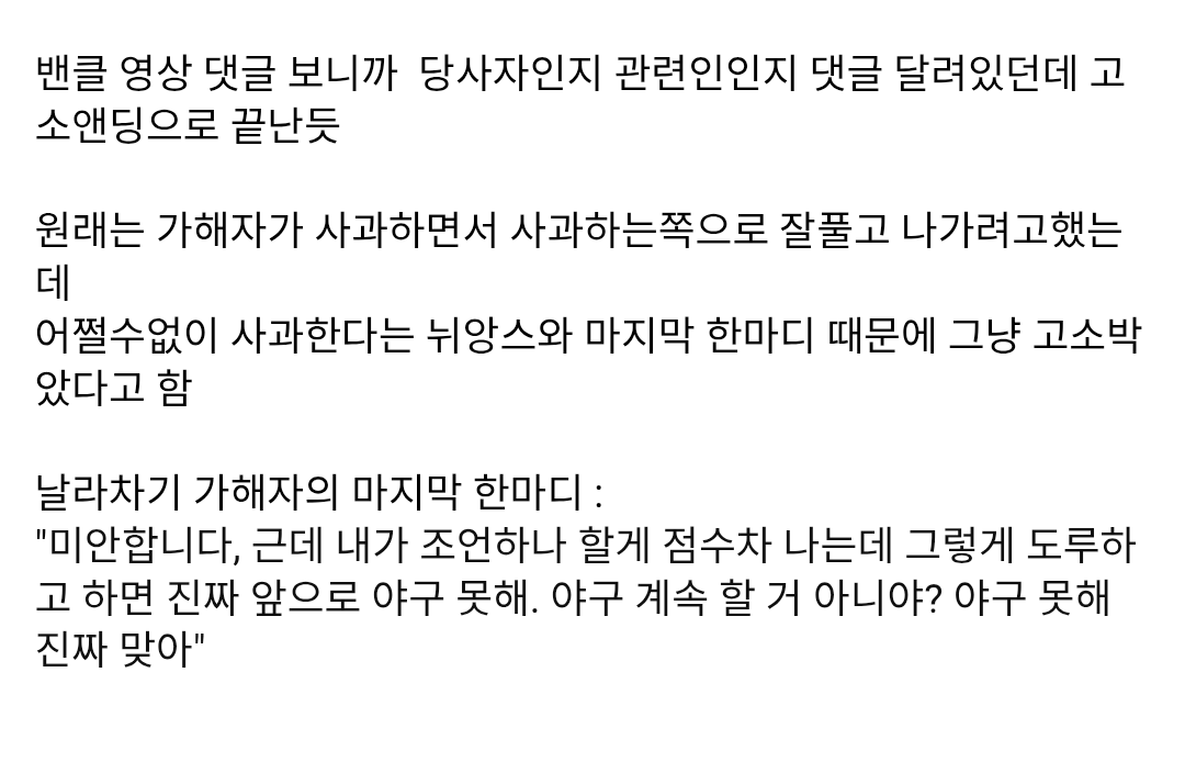몇년 전 여초 커뮤니티에서 본 사회인 야구 폭행사건 후기가 갑자기 떠올랐다.최근에 스페인 리그 선수 퇴장 관련 글을 읽다가 문득 그 사건이 어떻게 마무리됐는지 궁금해져서 다시 찾아봤다.결과적으로 벌금형으로 종료되었다고 한다.정말 한심하다. 저런 폭력배들은 금전 처벌만으로는 충분하지 않다.더 무거운 처벌을 받았어야 마땅하지 않을까 싶다.