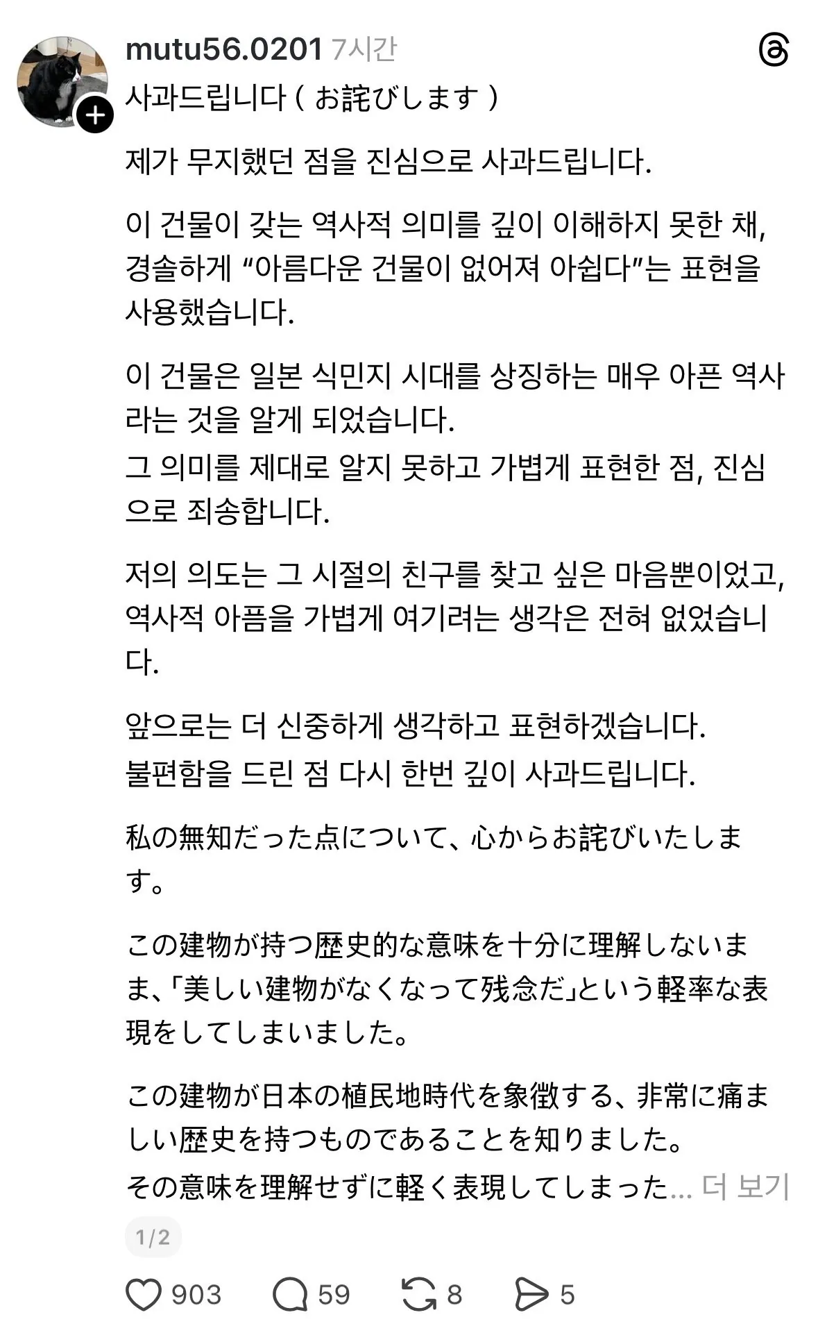 옛날 사진과 지금 사진을 비교하면서 없어진 건물을 아쉬워했다가 댓글에서 엄청난 질타를 받았다.