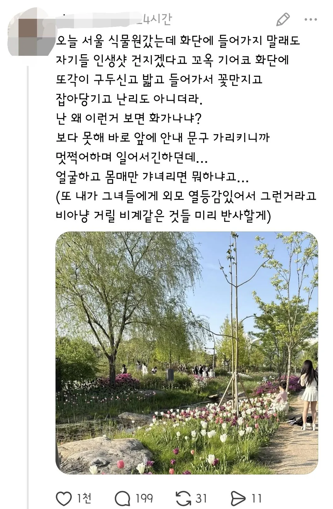서울식물원에서 화단 진입을 금지하고 경고문까지 설치했으나, 많은 방문객들이 이를 무시하고 화단에 들어가 꽃을 밟으면서 인증샷을 찍고 있다. 인스타그램에서 서울식물원을 검색하면 경고 안내를 무시하고 촬영한 사진들이 굉장히 많이 올라와 있다고 한다.