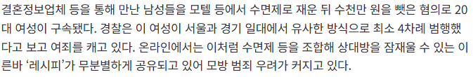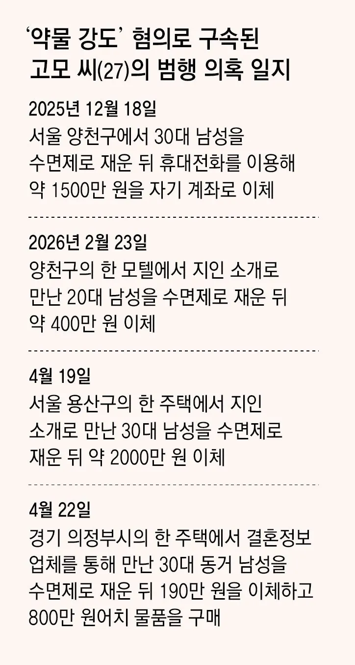 20대 여성이 남성 4명을 대상으로 수면제를 투여한 뒤 현금을 갈취한 사건이 드러났다.피해 규모는 약 4890만원에 이른다.또 다른 약물을 이용한 범죄 사건이 적발되면서 경각심이 높아지고 있다.
