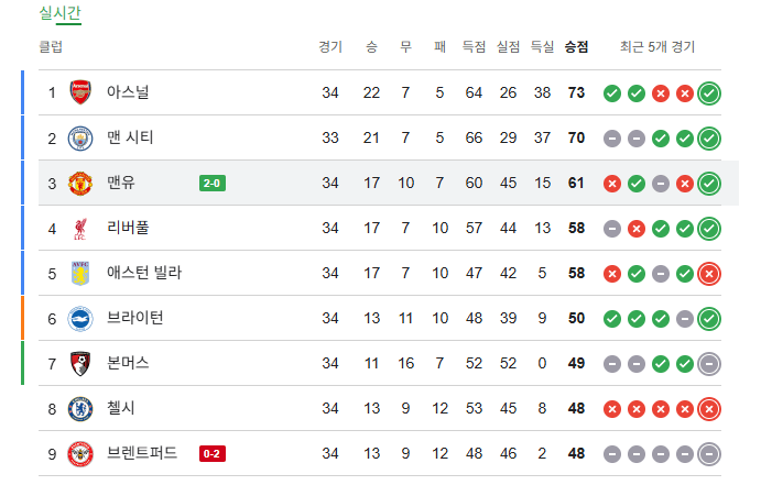 EPL 8위 9위 점수차 거의 없네