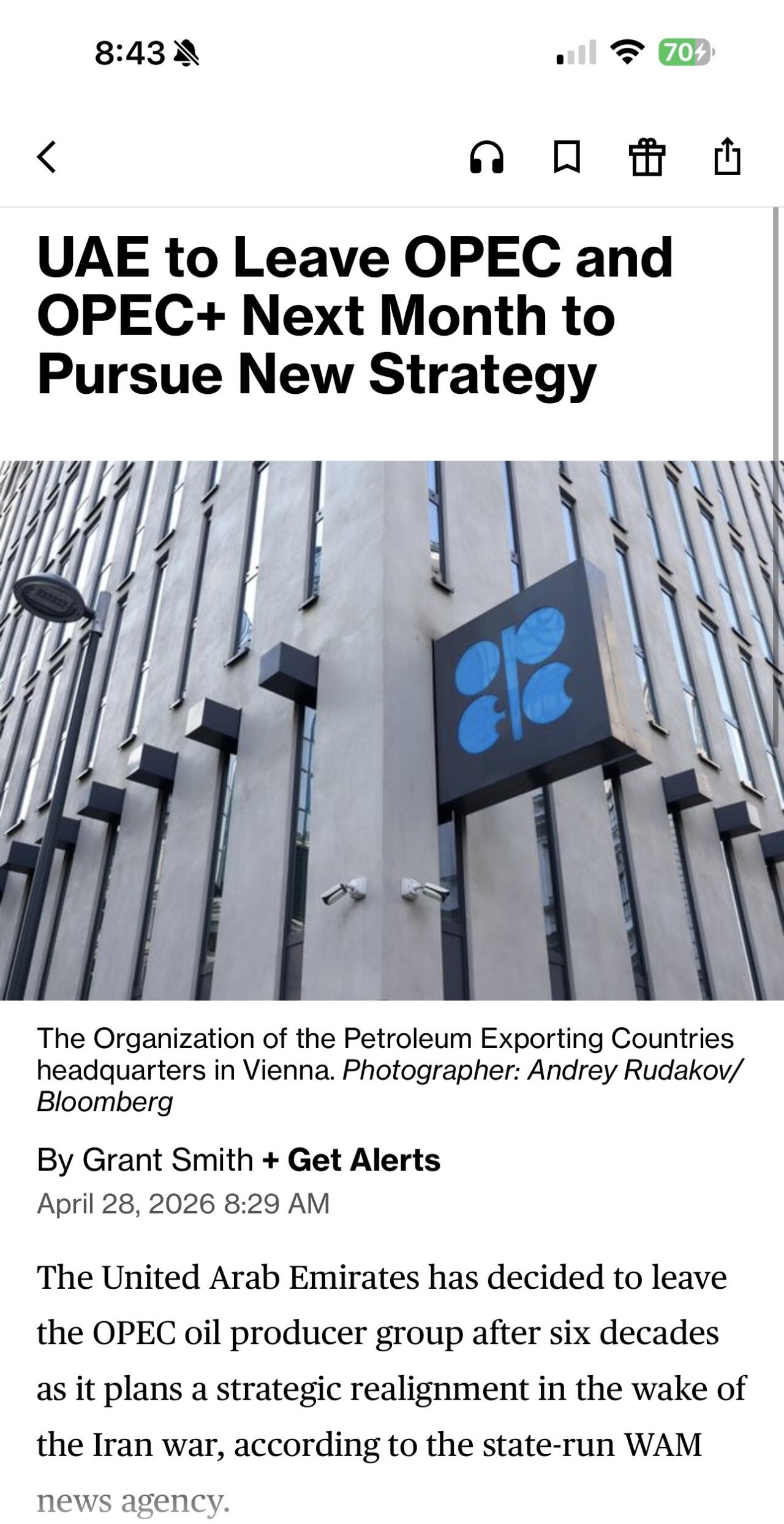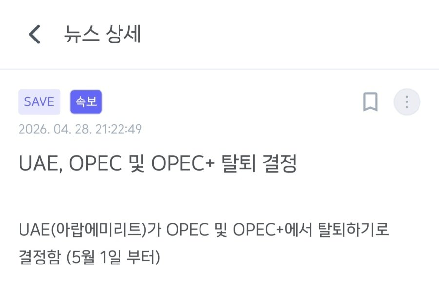 블룸버그 보도에 따르면 그동안 OPEC의 공급량 조정에 계속 불만이 있었던 거 같음이제 UAE가 자기들 맘대로 증산이나 감산을 할 수 있게 되는 건데아마도 증산 쪽으로 움직일 거 같네